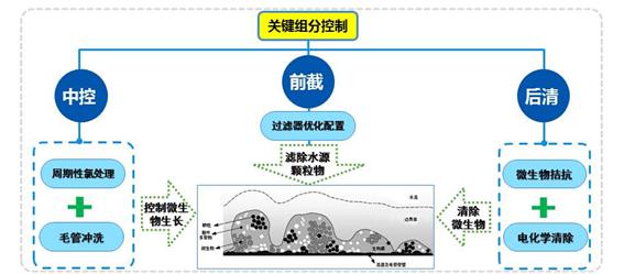 2.技术特点:靶向性,针对再生水回用滴灌系统灌水器不同堵塞阶段,采用不同的堵塞抑制方法,进行靶向控制;高效性,优化过滤器配置降低浊度79.6%,加氯配合毛管冲洗处理降低堵塞物质46.0%,微生物拮抗及电化学处理清除堵塞物质85%;系统性,从前期预防,到中期的控制,到后期产生堵塞物之后的定向清除,从再生水回用灌溉全过程的系统性控制。